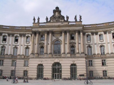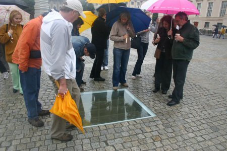 The Humboldt University and window to its symbolic "underground library" with empty shelves. The nazis burned books here in 1933 (Bebelplatz/Opernplatz)