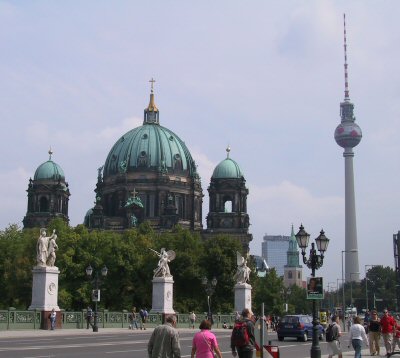 The ruins of Kaiser Wilhelm's Church with its new tower -- The old Cathedral (Dom), and the Ostankino TV Tower