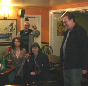 And then, it was nearly closing time! With red-needles in hand, we toasted the evening, Lizzytysh's brother Ron, whose birthday it was, and Lizzytysh herself. I'm pleased that I managed to record this with glass in left hand and camera in my right!