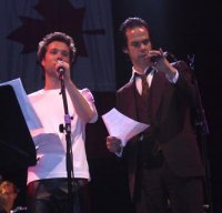 Nick joined Julie and Perla on Suzanne, and while some lyric pages blew away, the interpretation worked well anyway. Teddy impressed with a sardonic, rocking The Future, which he noted, “seems an awful lot like now.” Rufus wise-cracked he was celebrating the legalization of sodomy, and joined with his mom on what he called “the Leonard Cohen meets Doris Day version” of Everybody Knows. He claimed his intention was “to fag it up” and gave an enjoyable interpretation. Winter Lady was liltingly sung by Kate and Anna, then Perla and Julie brought hearts into throats with Anthem. Concluding on another rocking, jazzy note, Rufus and Nick sang and danced together on Don’t Go Home With Your Hard On.