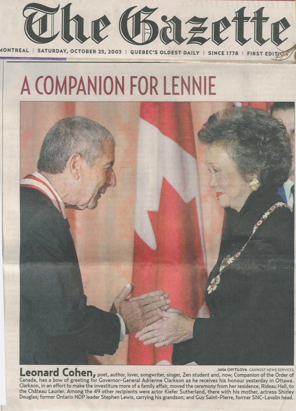 by Yahoo Canada News, January 17, 2003OTTAWA (Reuters) - Leonard Cohen, the smokey-voiced singer, songwriter, poet, novelist and Zen monk whose songs have been recorded by the music industry's elite, was awarded Canada's highest civilian honor on Friday for achievement in the arts and pop culture.