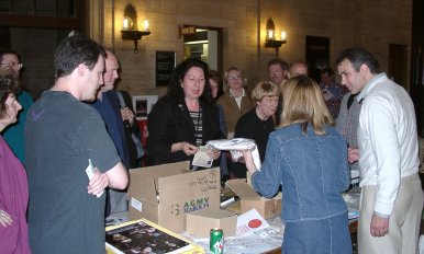 | Donna and Geoff Compers receiving attendants at the registration desk in Moyse Hall. Liz Madder and Ray Webster (UK) get their Event Pack - the program booklet, the Event ring, and the pin of The Order of the Unified Heart, both gifts from Leonard. For more info, check the Event Memorabilia page. The official Event T-shirt and the Event poster were also available.