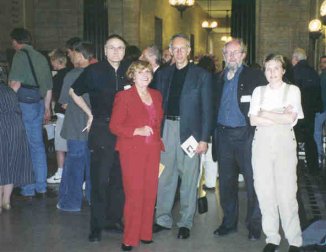 | Event guests getting together before the official opening. Yvonne Hakze (editor of the Intensity fanzine, from Holland, on the right), professors Stephen Scobie and Ira B. Nadel, Ms. Esther Cohen, Leonard's sister, and Jarkko Arjatsalo. |