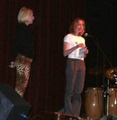 | Bill Van Dyk opened the Event at 7 pm, and after his welcome speech Kelley Lynch, Leonard's manager (on the left), and Leanne Ungar, Leonard's sound engineer, forwarded Cohen's greetings to The Event. They played three songs from Leonard's next album: "My Secret Life", "Here It Is", and "A Thousand Kisses Deep". Attendees witnessed the world premiere of these beautiful new songs.