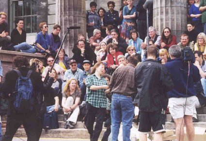 ![]() | Our Closing Time session took place on the steps of the Moyse Hall. Winners of Elizabeth Hoffman's clever Trivia Quiz were announced, and signed CDs and books donated by Leonard, Sony, and McLelland and Stewart were distributed to winning participants. Finally, Jan Erik Lundqvist ended the Event with his rendition of the song, Dance Me To The End Of Love. |