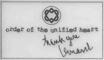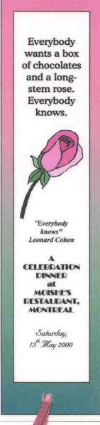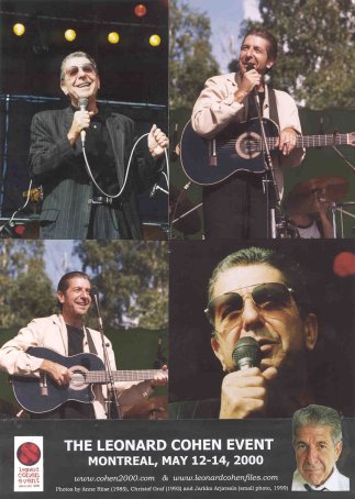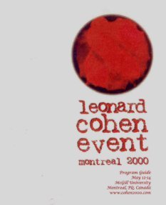 A hummingbird is the motif of the Event Ring, donated to all participants by Leonard. The engraved texts: "Leonard Cohen" and "Montreal 2000" ![]() ![]() The Pin of the Order of the Unified Heart also donated by Leonard, and his greeting to the attendees ![]() The Event Poster ![]() Program Guide The program guide included not only the schedule but also information on the performers, and Cohen's early, unpublished work from the 60's (short stories and poetry) ![]() Special Event Bookmark Designed by Liz Madder given to guests of the Celebration Dinner at Moishe's ![]() some kind of record Poems in Tribute to Leonard Cohen by Stephen Scobie Published in an edition of 250 copies for The Leonard Cohen Event All the poems in this series begin with a line, or sometimes two lines, which are the openings of poems or songs by Leonard Cohen ![]() Essays on Canadian Writing Leonard Cohen Special Issue Edited by Stephen Scobie This book was published only a few days before The Event, and the participants were the first to read it. 263 pages of essays on Leonard Cohen and his work. Click for more information |