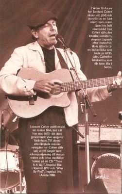 The special edition of Leonard Cohen's second novel Beautiful Losers was published in Sweden at the end of 1998. A special bonus CD is attached in a cover pocket. This edition was limited to 2.000 copies. The front cover photo (above, left) is a painting of Catherine Tekakwitha, the mohawk indian girl who lived in the 17th century. Leonard has this painting on his wall in his Los Angeles office. On the back cover there is an excellent concert photo by Hols/Semneby showing Leonard on stage on July 15, 1985, in Borgholm, Sweden.