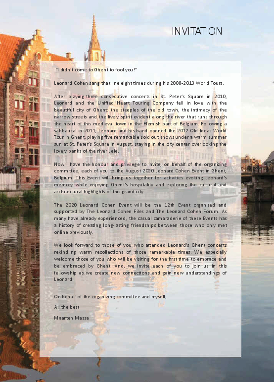 The next Leonard Cohen Event will take place in Copenhagen, Denmark, in August 2024. Marianne Nielsen will be the organizer. More info to follow!