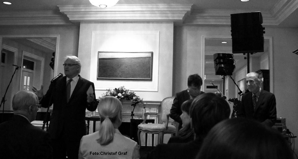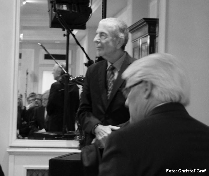 All in all, now, in 2014, Cohen doesn’t look like an 80 year old. I know 60 and 70 year olds, who actually look older. All attendees seem to be thinking the same thing. 104 minutes in the life of Leonard Cohen begins. One of the SONY-Women accompanies Cohen to podium. Kory stays in the background. The high Commissioner welcomes Cohen warmly and leads into the topic of “Cohen”, by talking about memories of their first encounter. Then Cohen thanks him for his kind words and invites the attendees to listen to the new album together. Cohen smirks sheepishly and says that he doesn't dare look into the faces of the listeners during the session and would prefer to wait next door. He retires by saying “see you, 36 minutes later”. There's a great applause, followed by the first sounds of “Slow”, forcing everybody into a voluntary silence. By then nearly eight minutes had already passed and the audience were listening to the lines of the first Song called “Slow”