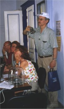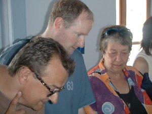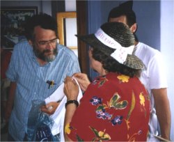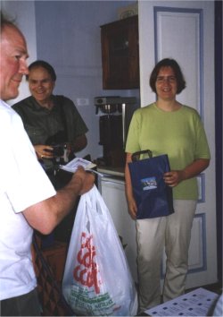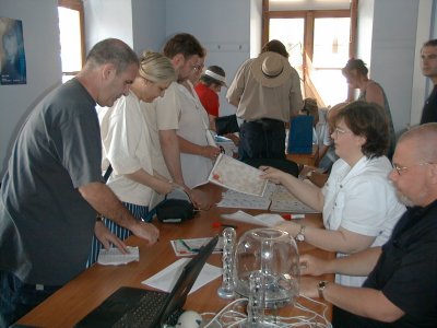Ray Webster (UK) already got his shirt. Barbara Mayer (Germany) passes the bag of Event mementos, Jarkko Arjatsalo (Finland) watching.