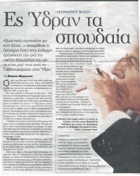 In this island Cohen wrote some of his best works, prose and poetry. Some of the songs of his last album-Ten New Songs- were written on Hydra. And now? Right now Leonard is in Los Angeles, writing new songs for his next album, and if his well-known perfectionism doesn’t intervene, his wish is to release it soon.