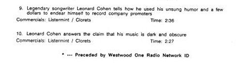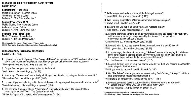 INTERVIEWS ON ALBUMS The Future Radio Special Interview (1992)![]() This promotional CD was released for the use of radio stations. It's probably one of the rarest recent Leonard Cohen collectors' items. ![]() Thanks to Vlad Arghir, Germany, for loaning this rarity! The Earth News Radio Interview (1988)![]() ![]() This 12" album from the year 1988 by Earth News Radio presents exclusive interviews with Leonard Cohen (two segments 2:36 & 2:27).