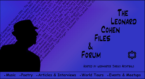 20th ANNIVERSARY of the LEONARD COHEN FILES SEPTEMBER 3, 2015 Results of Our Logo Design Competition Read more comments here on The Forum! THREE FIRST PRIZE WINNERS Each winner gets a memento with Leonard's Personal Inscription (In alphabetical order) ![]() Designed by Beverley Kussrow (Australia) * * * ![]() Designed by Marie Nolan (Ireland) * * * ![]() Designed by Ania Nowakowska (Australia) * * * RUNNERS-UP The designers get a collector's piece. ![]() Designed by Ken Forsyth (UK) * * * ![]() Designed by Geoffrey Wren (Norway) * * * SPECIAL PRIZE All logos sent to our competition were eligible for the allotment of this prize, a memento with Leonard's Personal Inscription. We didn't have just one Lady Fortune but three of them: Sharon Robinson and Charley and Hattie Webb! The winner is: Kadir Ercan, Germany * * * A Selection of other Logos designed by the Forum members (in alphabetical order) * ![]() Designed by Vlad Arghir (Germany/Romania) * * * ![]() Designed by Livia Battistini (Italy) * * * ![]() Draft for the design by Clive Cass (UK) * * * ![]() Designed by Kadir Ercan (Germany/Turkey) * * * ![]() Designed by Martin Ferrabee (UK) * * * ![]() Designed by Martin Ferrabee (UK) * * * ![]() Designed by Martin Ferrabee (UK)) * * * ![]() Designed by Ken Forsyth (UK) * * * ![]() Designed by Roman Gavrilin and Dmitry Pozhilov (Russia) * * * ![]() Designed by Mark Hillier (UK) * * * ![]() Designed by Beverley Kussrow (Australia) * * * ![]() Designed by Beverley Kussrow (Australia) * * * ![]() Designed by Gwen Langford (Ireland) * * * ![]() Designed by Eva Martonyi (Hungary) * * * ![]() Designed by Maarten Massa (Blegium) * * * ![]() Designed by David Meloni (USA - NJ) * * * Designed by Greg Ross (Australia) * * * ![]() Designed by Phillip Smith (UK) * * * ![]() Designed by Lennard Torbijn (The Netherlands) * * * ![]() Designed by Simone Wagner (Germany) * * * ![]() Designed by Diane Williams (UK) * * * ![]() Designed by Beata Wołoszyn (Poland) * * * Designed by Beata Wołoszyn (Poland) * * * ![]() Designed by Geoffrey Wren (Norway) * * * ![]() Designed by Anonymous * * *