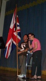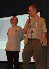 Nikki Olson and Kim Solez (Alberta) with ...the robotic dogs Leo and Boris (Japan)